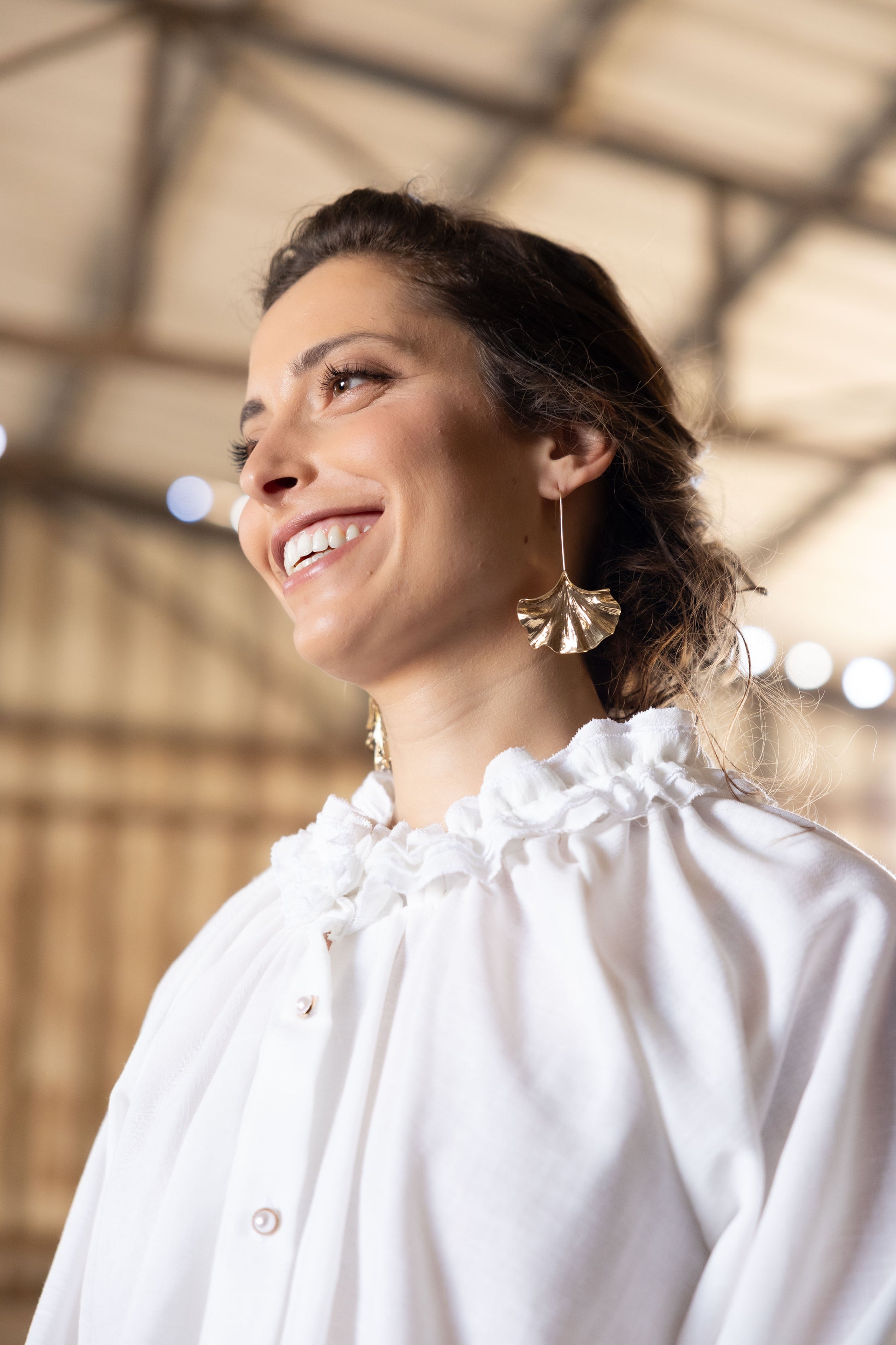 שילוב של שרוולים וצוואר מטריפים עם כפתורי פנינה